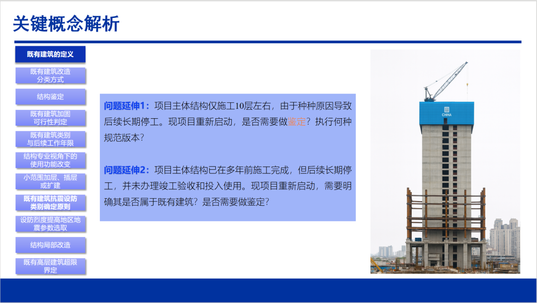 (2)关键概念解析:包括既有建筑的定义,既有建筑改造方式分类,结构鉴定,既有建筑加固可行性判定,既有建筑类别与后续工作年限,结构专业视角下的使用功能改变,小范围加层、插层或扩建,如何确定既有建筑抗震设防类别,设防烈度提高地区地震参数选取,结构局部改造,既有高层建筑超限鉴定等